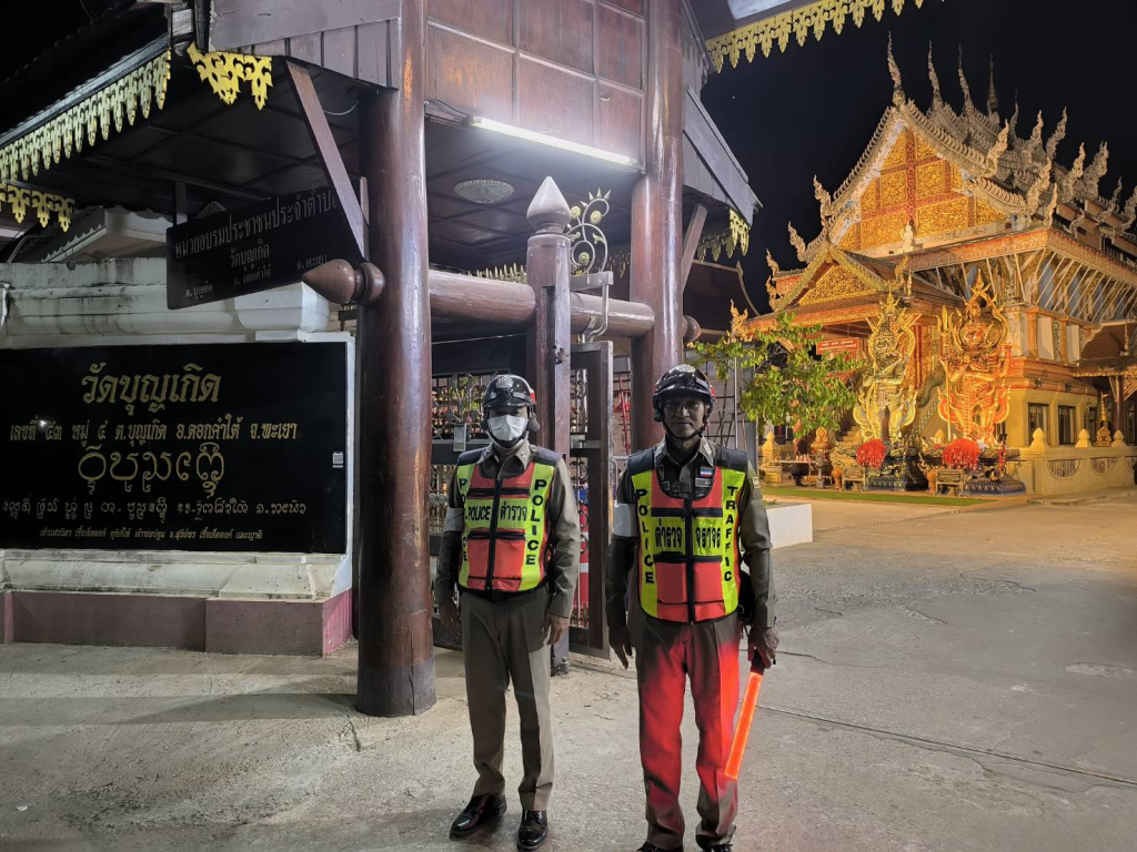 เจ้าหน้าที่ตำรวจจราจร สภ.ดอกคำใต้ อำนวยความสะดวกด้านการจราจรงานสวดพระอภิธรรมศพหลวงปู่ก้ำ ฯ ณ วัดบุญเกิด อ.ดอกคำใต้ จว.พะเยา
