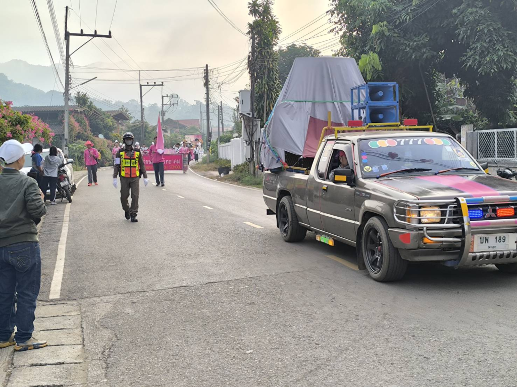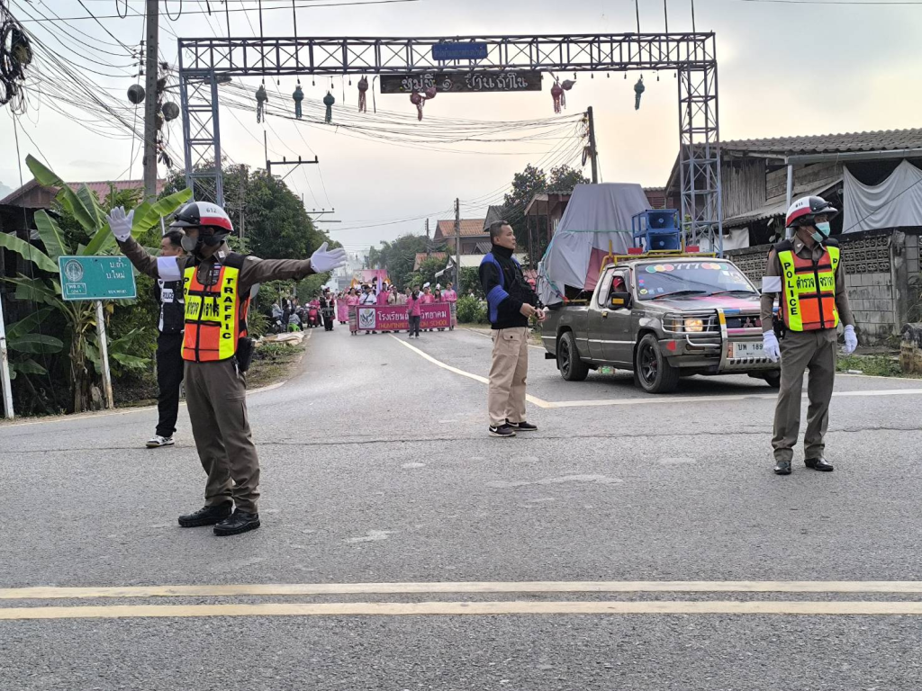 อำนวยความสะดวกและจัดการด้านการจราจรขบวนพาเหรดนักกีฬาสี   โรงเรียนถ้ำปินวิทยาคม