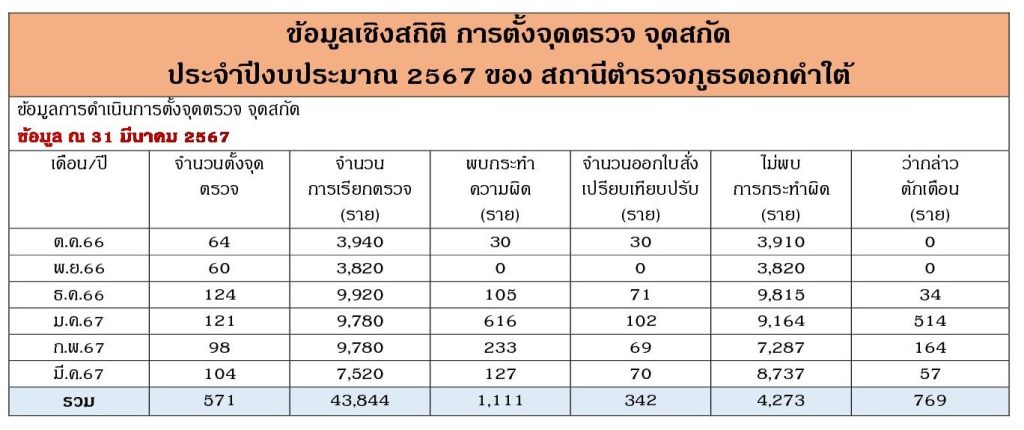 ข้อมูลผลการดำเนินงานเชิงสถิติในการตั้งจุดตรวจ จุดสกัด