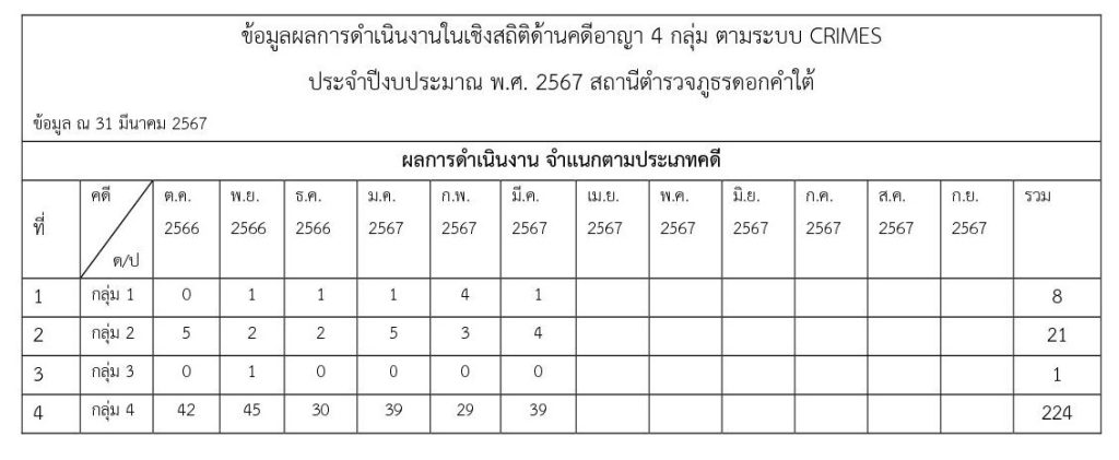 ข้อมูลผลการดำเนินงานในเชิงสถิติด้านคดีอาญา ประจำเดือน มี.ค. 67